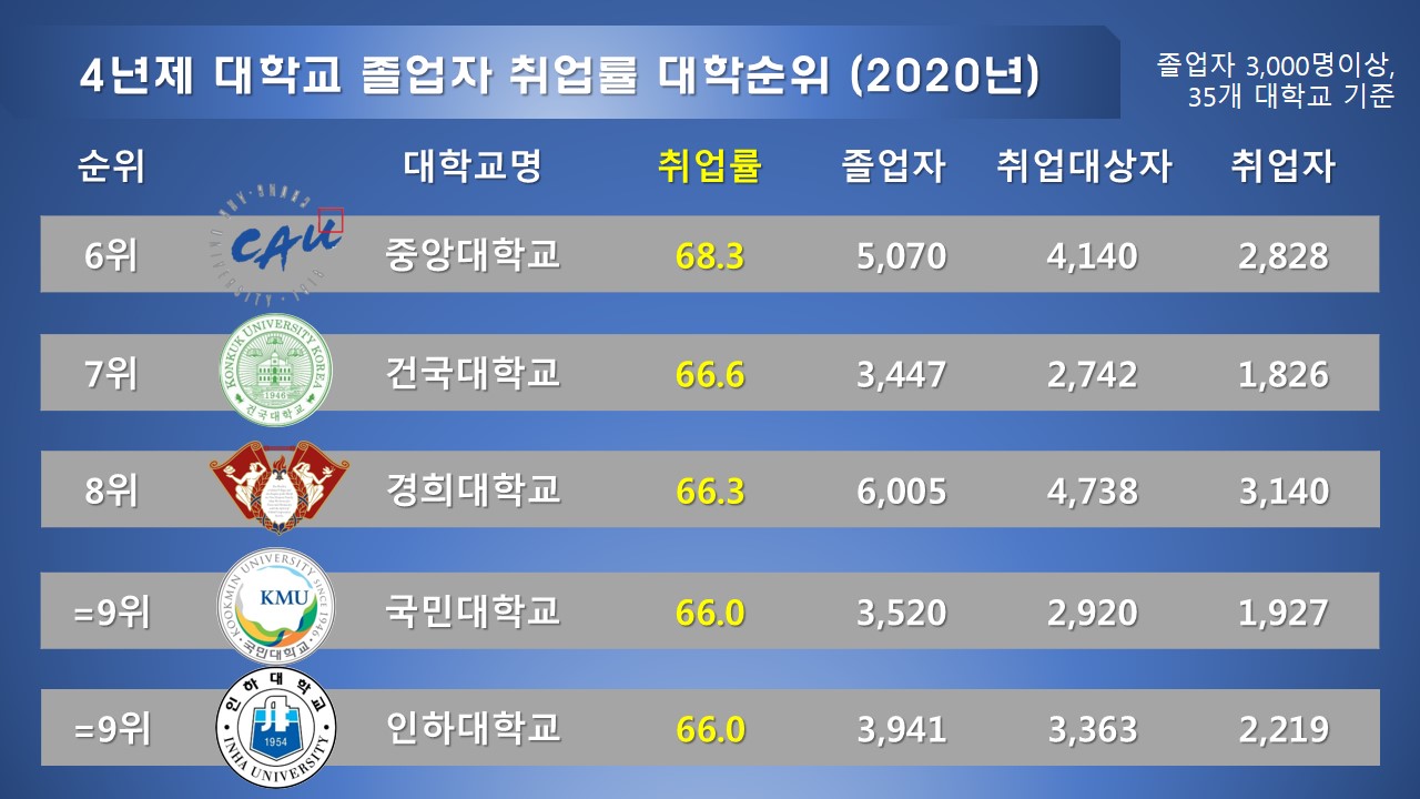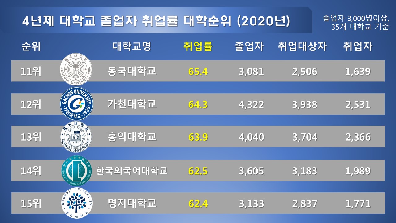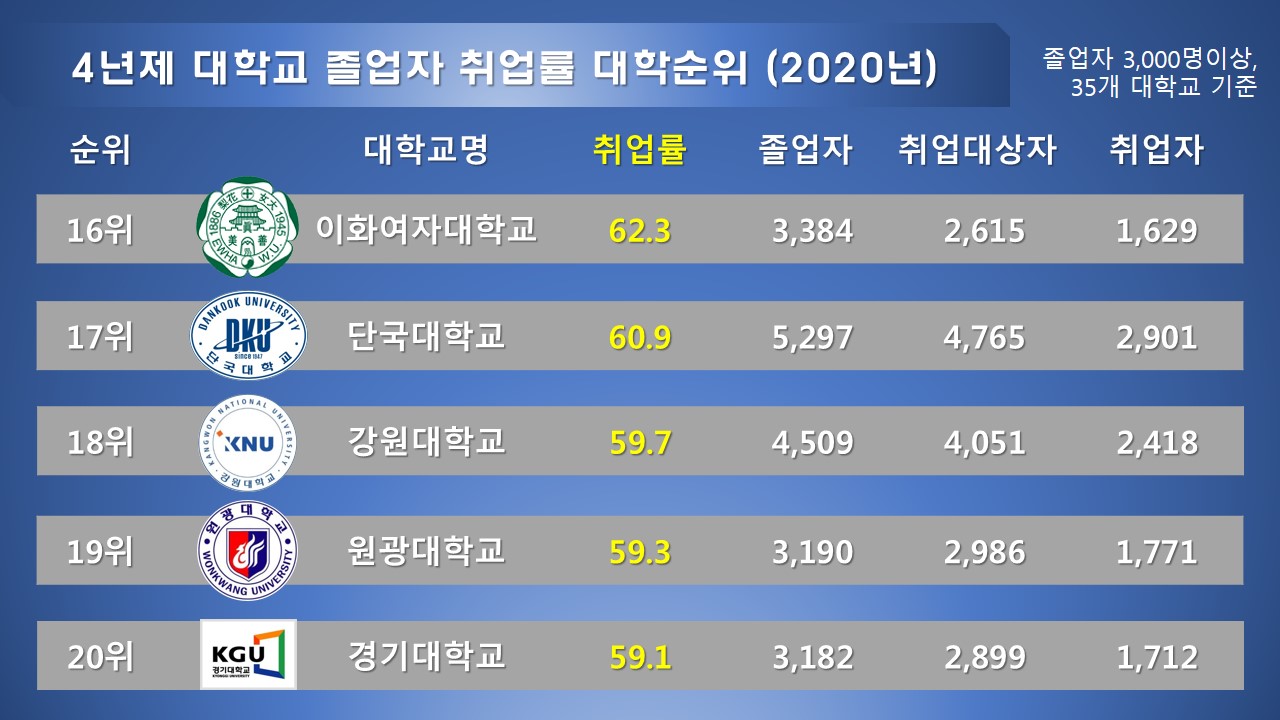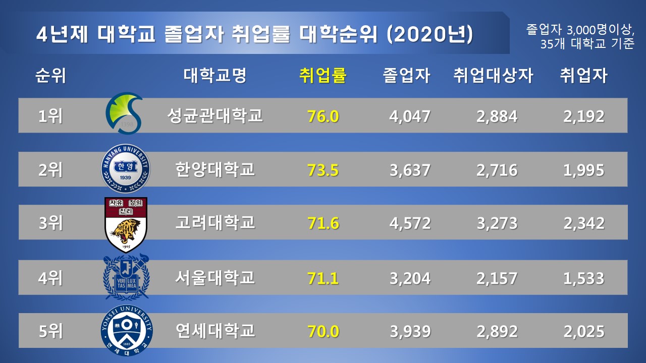 (해당 자료는 2020년 결과를 기준으로 4년제 대학교 중 연간 졸업생 3,000명 이상의 대학교