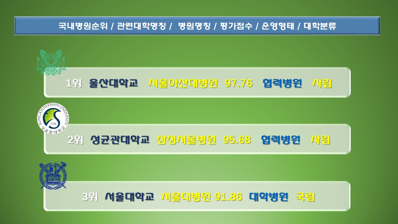 그럼 국내 대형병원 순위로 본 의대 순위를 시작하겠습니다.