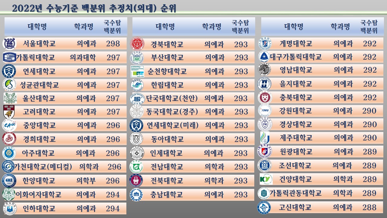 금번에는 의과대학중 의대, 치의대, 한의대의 예상합격점수를 확인해 보았습니다.