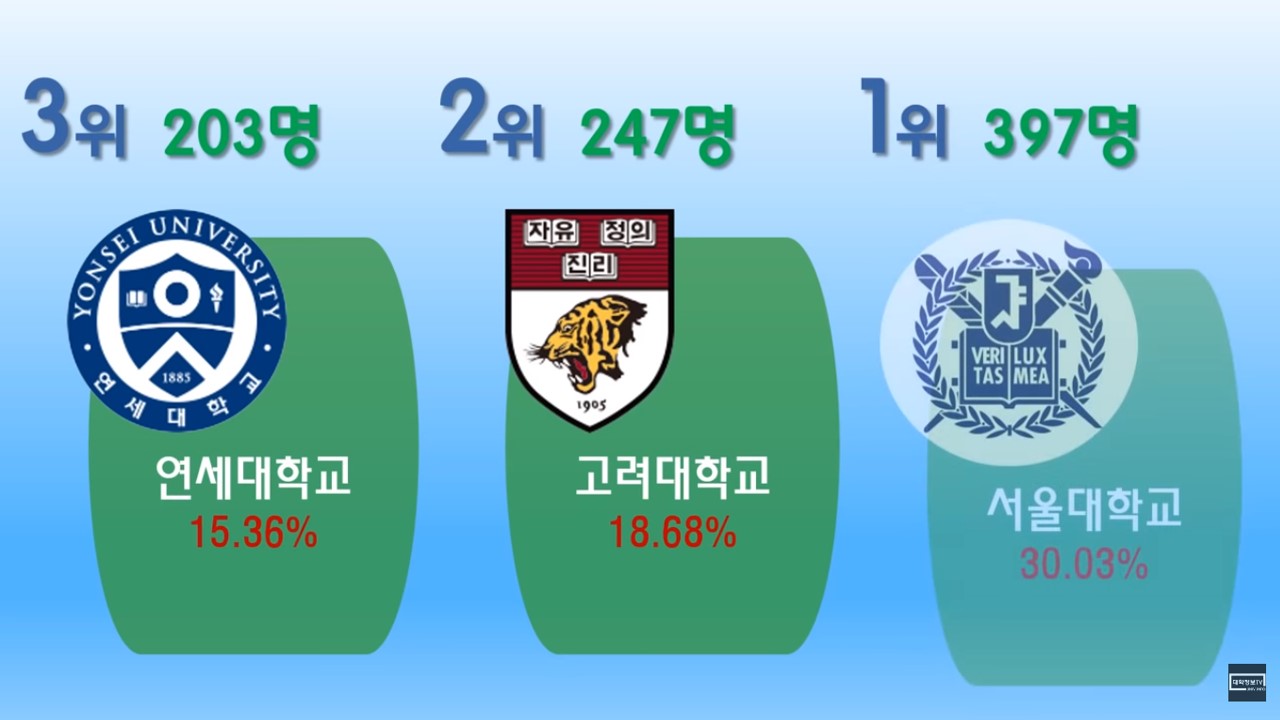 어느 정도 예상은 하셨겠지만 전체 인원중 SKY대학교가 차지하는 비중은 64%에 이를 정도로 엄청남 비율을 차지하고 있습니다.
