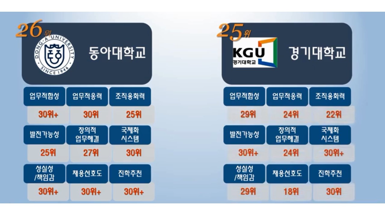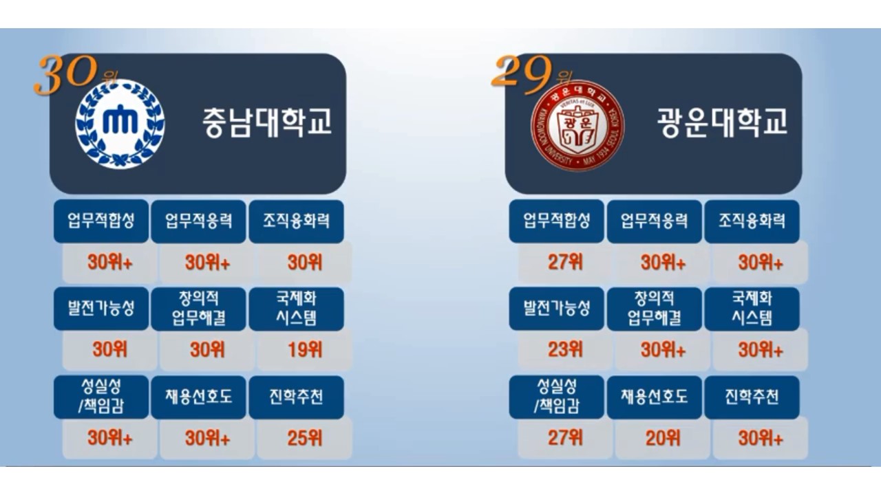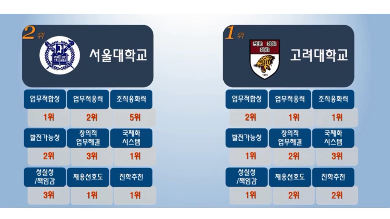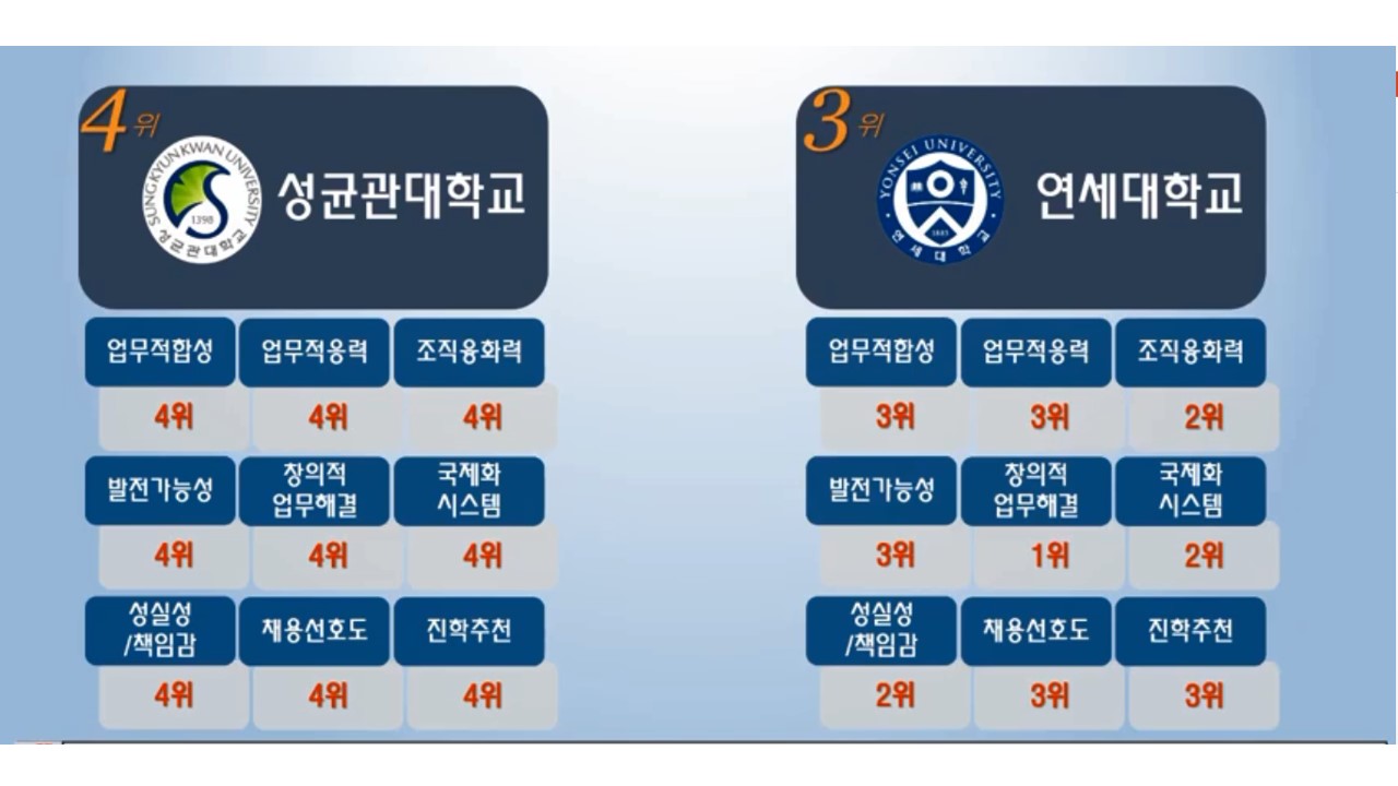 상기 순위대로 경영대학교 부문은 서울대 보다도 고려대학교가 전반에 걸쳐