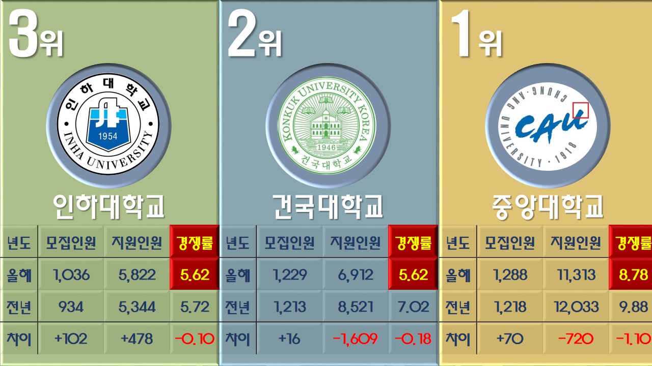 이제 마지막 1~3위까지의 순위입니다. 3위는 인하대하교입니다. 전년에 비해 경쟁률은 약간 낮아졌지만 5.62라는 높은 경쟁률을 기록했네요