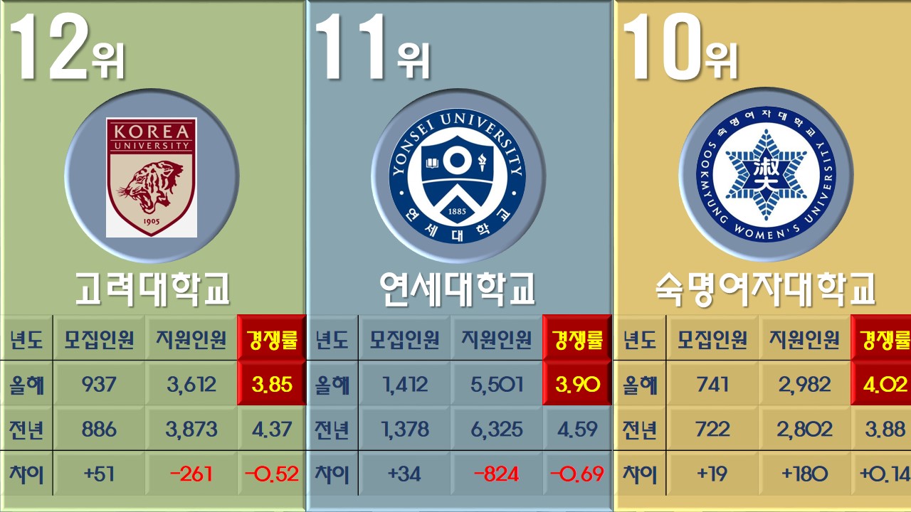 12위와 11위는 사학명문 고려대학교와 연세대학교가 차지했습니다. 모두 모집인원은 늘었으나 지원인원이 감소해서