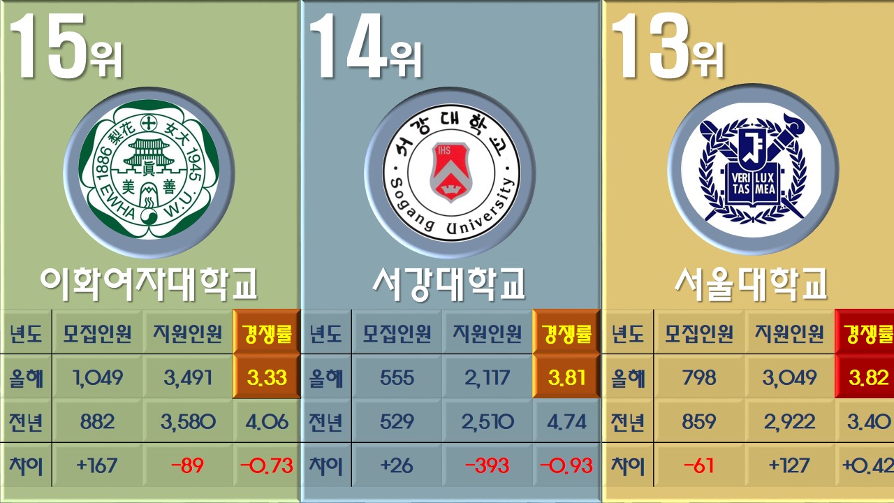 먼저 15위는 이화여대가 차지했습니다. 전년보다 늘어난 모집인원에 비해 정시지원수가 줄어 3.33의 경쟁률을 보였습니다.