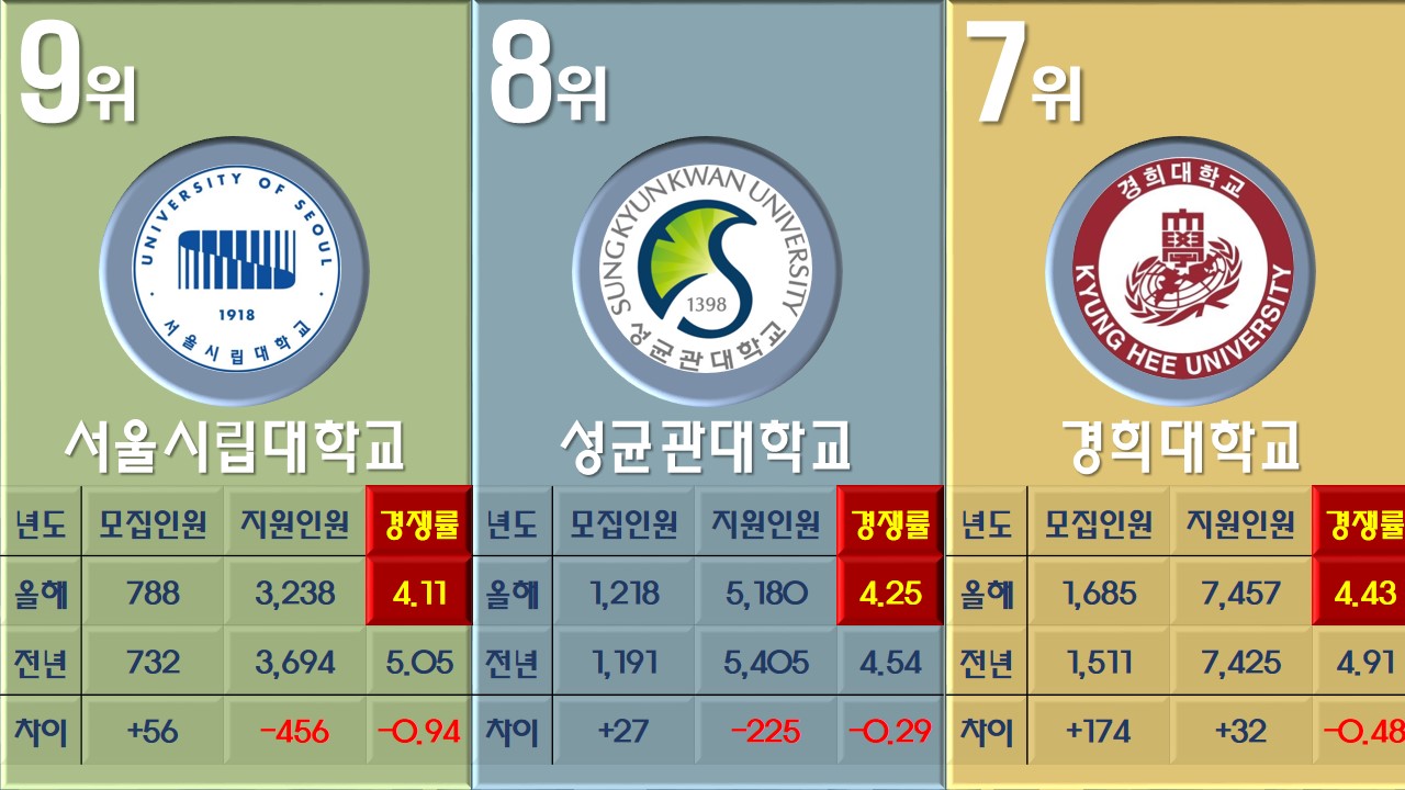 7~9위는 경희대학교, 성균관대학교, 서울시립대학교가 차지했습니다. 서울시립대와 성균관대는 지원인원이 감소해서
