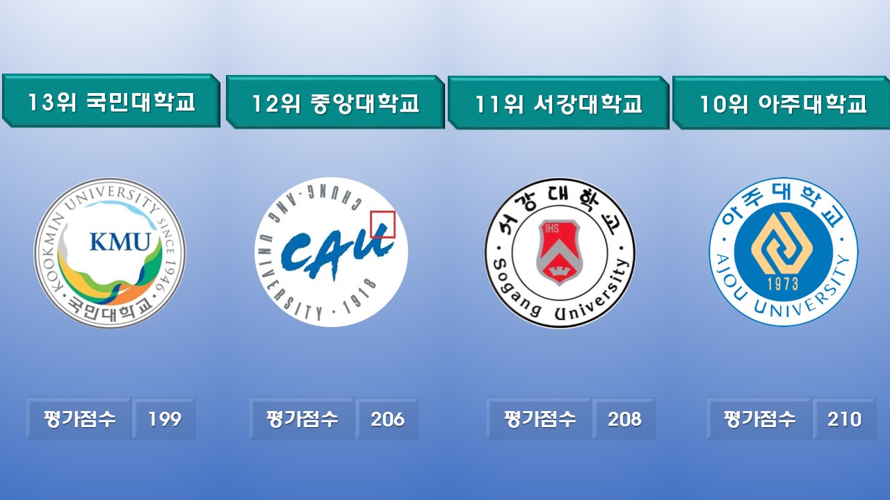 12위는 이,수학계열 강자인 중앙대학교가 위치했네요