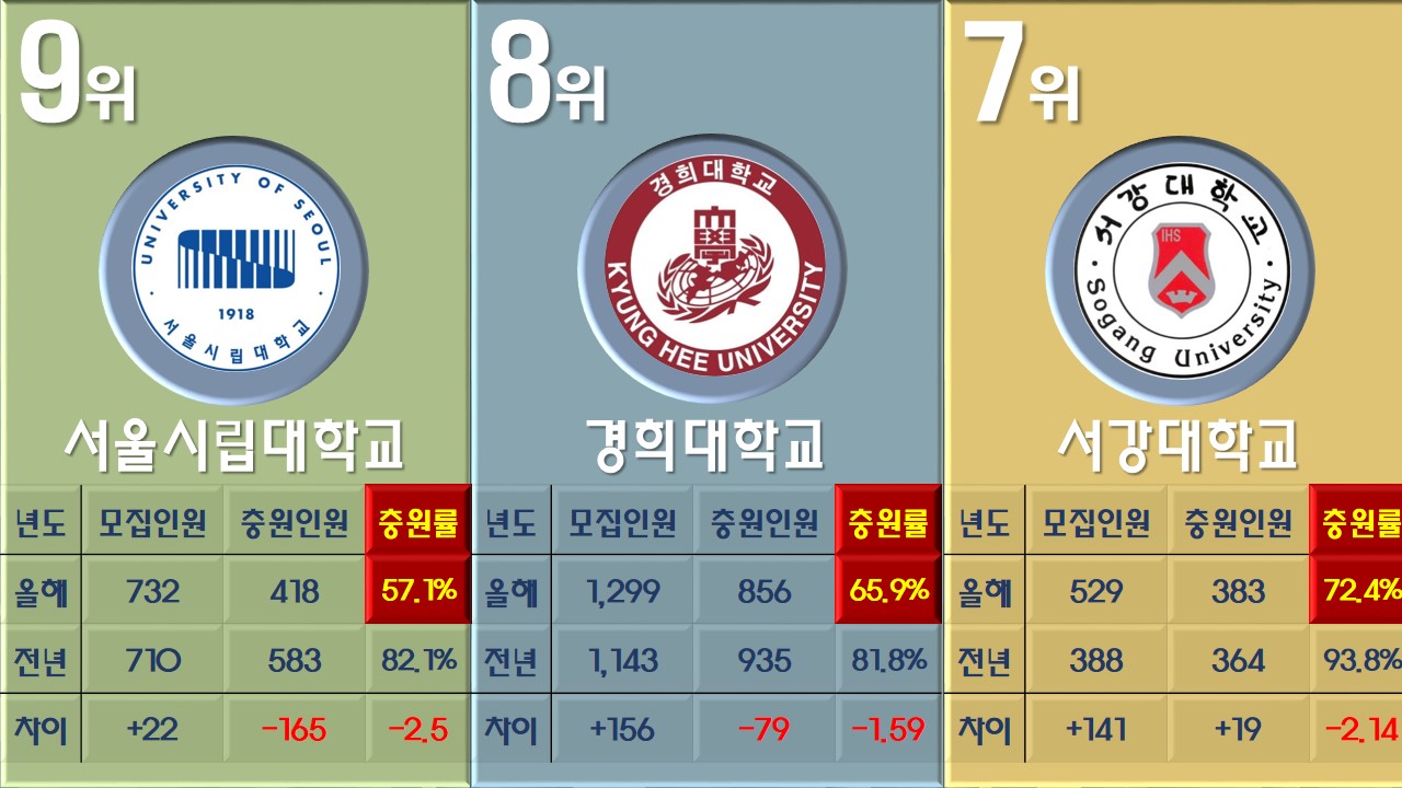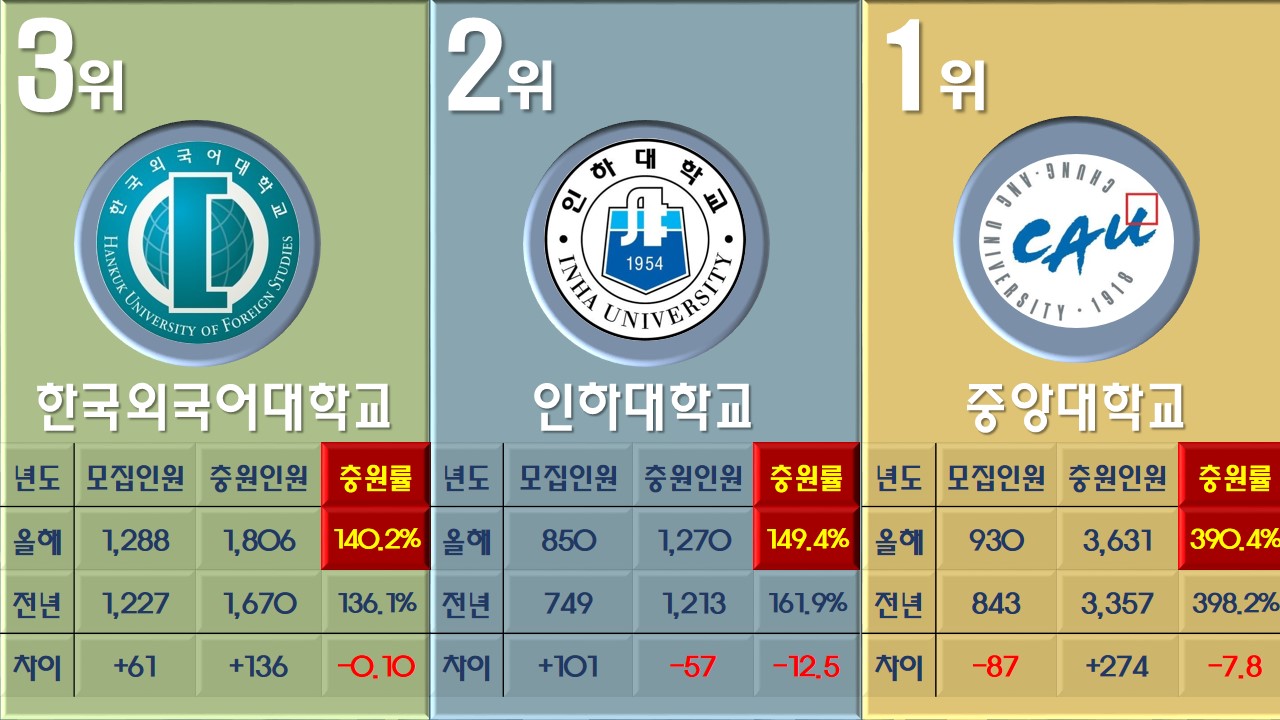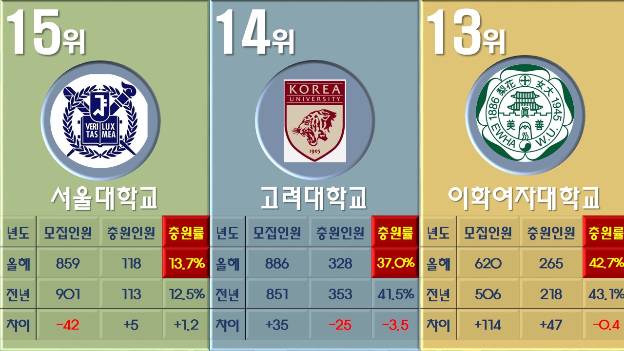 이번에는 21학년도 정시전형 상위15개 대학의 충원률 순위로 찾아왔습니다.