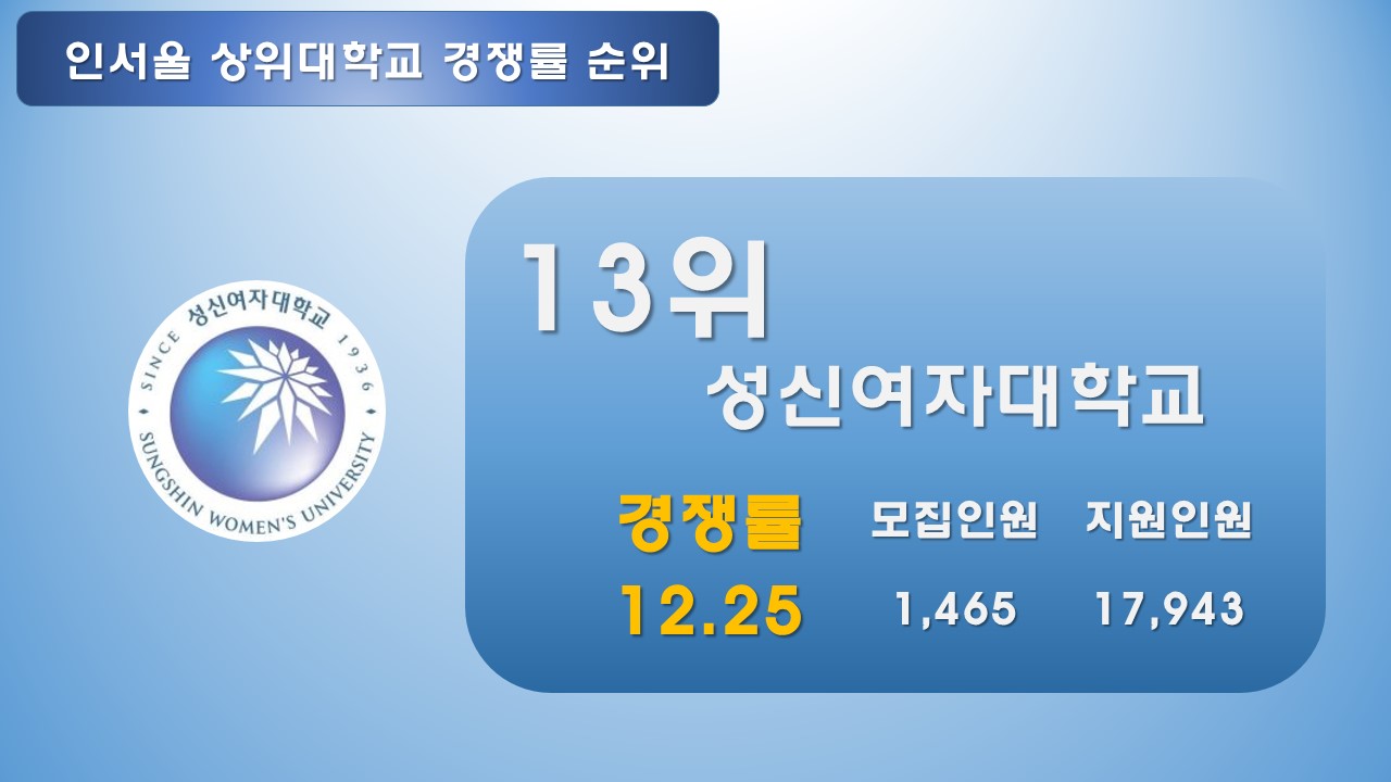 14위는 이화여자대학교입니다. 서울대보다는 한 순위 위지만 경쟁률은 두 자리가