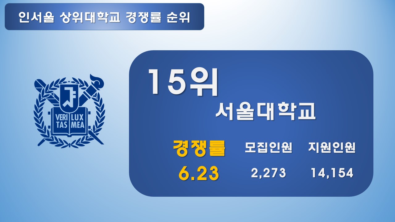 15위는 서울대학교입니다. 높은 지원기준으로 상대적으로 경쟁률은